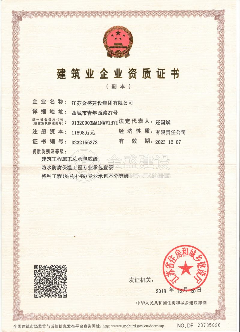 • 施工總承包貳級(jí)新防水防腐保溫工程專業(yè)承包一級(jí)